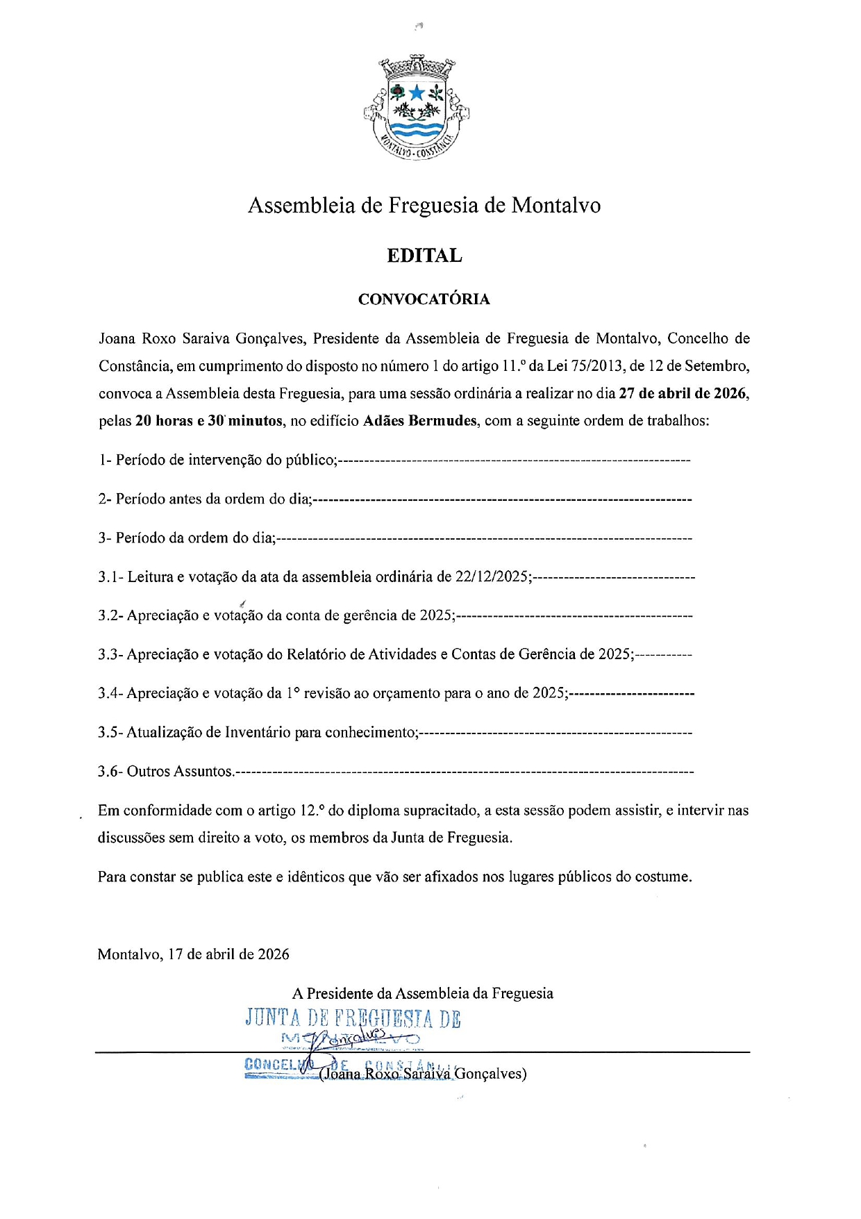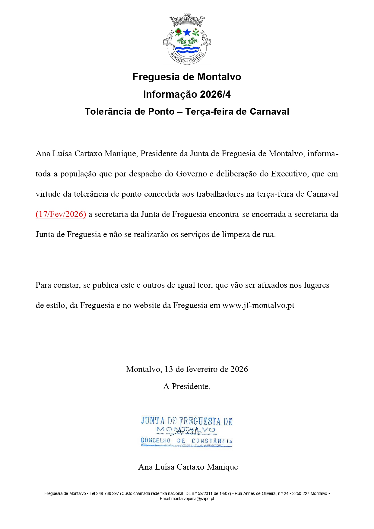 Como Presidente da Junta de Freguesia de Montalvo, reeleita para o meu último mandato, no passado 12 de outubro, aproveito esta oportunidade para expressar o meu sincero agradecimento, a todas as pessoas que confiaram em mim e na minha equipa para mais um mandato cheio de desafios.